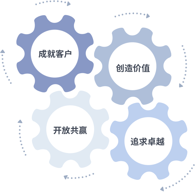 成就客户是一切决策的出发点,,,,创造价值是衡量所有工作的标准,,追求卓越是我们做事做人的态度,,开放共赢是我们的格局也是最终的结果。。。价值观的齿轮环环相扣,,,推动着组织里的每个人不断向前。。。。